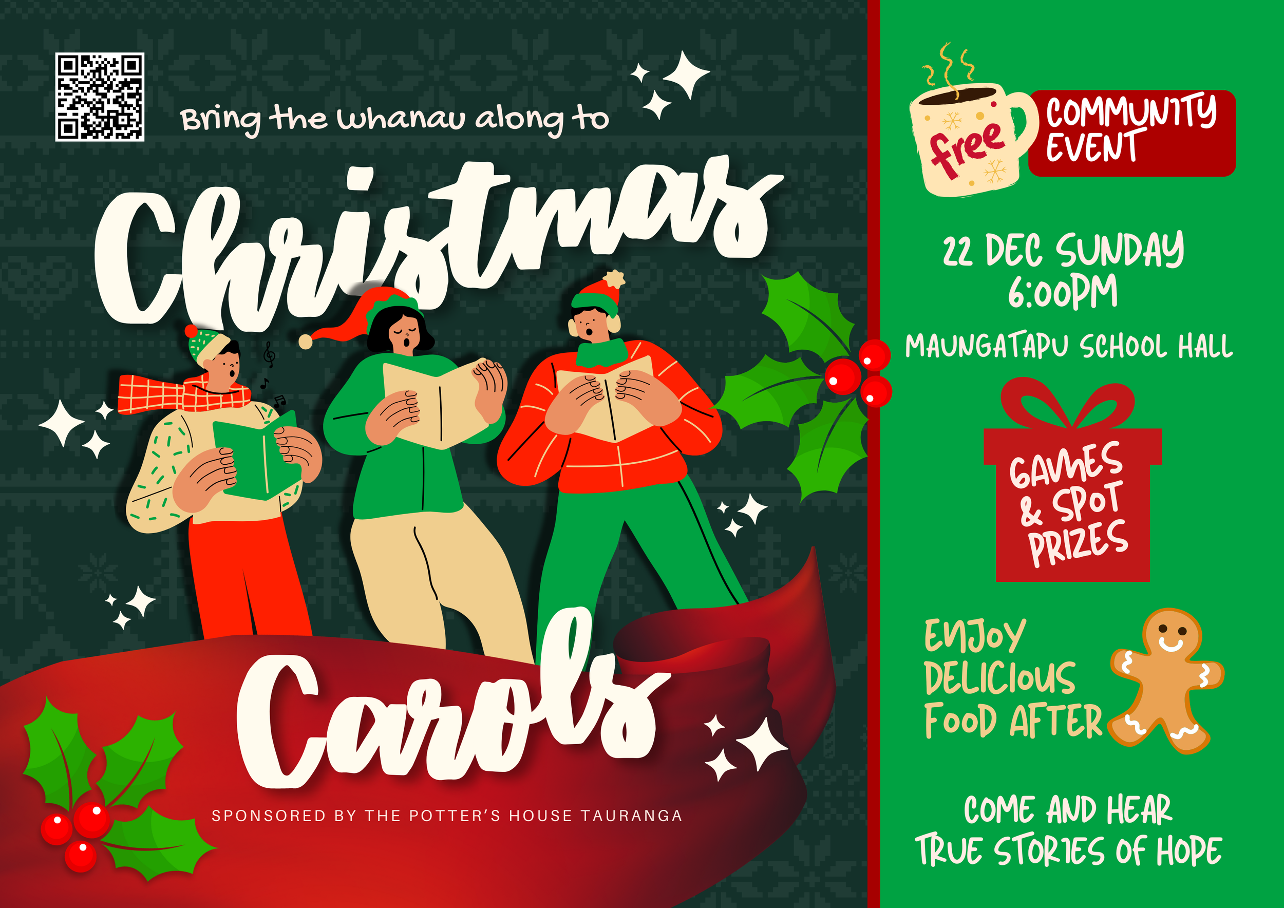 Bring the whanau down to Maungatapu School Hall on 22nd December at 6pm for a free community event. Sing along to some classic carols, grab some yummy food afterward, and enjoy a few games and spot prizes too!